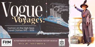 Get on board with a fashion display that manifests the grandeur of travel during the steamship era. View clothing and outfits that made waves. In proud partnership with the Fashion History Museum.